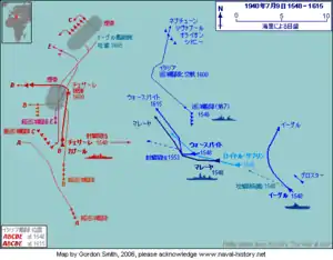 - 16 destructores: Nubian, Mohawk, Hero, Hereward (averiado), Decoy (averiado), HMAS Stuart,[24] Hyperion, Hostile, Hasty, Ilex, Dainty, Defender, Juno, Janus, HMAS Vampire,[25] and HMAS Voyager.[26]