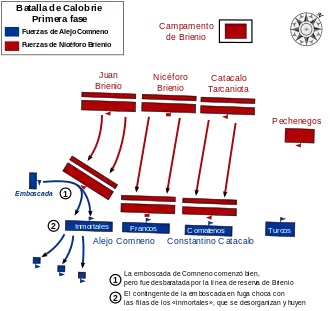 Habiendo restaurado el orden entre las fuerzas supervivientes de los primeros choques y consciente de la confusión reinante en las unidades de Brienio, Comneno decidió contratacar. El plan que dispuso hacía mayor uso de las habilidades peculiares de sus arqueros turcos de a caballo. Dividió su fuerza en tres grupos, de los cuales dos quedaron en retaguardia, emboscados. El otro, formado por los inmortales y los comatenos y mandado por el propio Comneno, no fue dispuesto en una línea continua, sino que se dispersó en pequeños grupos, entremezclados con otros contingentes de jinetes arqueros. Este grupo avanzó contra los rebeldes, los atacó y luego fingió retirarse para atraerlos a la zalagarda.[20][29]