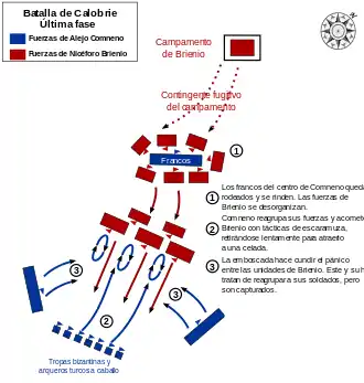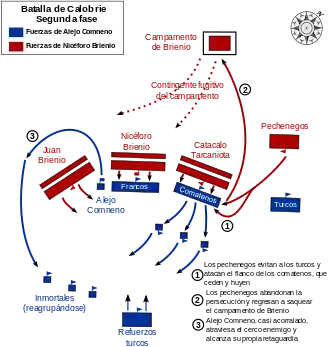 A pesar de este contratiempo, la victoria de Brienio parecía segura, y sus alas comenzaron a envolver a los francos del centro de la línea imperial. Fue entonces cuando Comneno percibió su apurada posición. Desesperando en la inminente derrota (en parte, como registra Nicéforo Brienio el Joven, porque había desobedecido las órdenes imperiales de esperar más refuerzos turcos y temía el castigo de Botaniates), al principio resolvió intentar un ataque decisivo contra Brienio para privar a las fuerzas enemigas de su jefe, pero uno de sus criados lo disuadió de emprender semejante plan. Con únicamente seis hombres, consiguió atravesar el cerco enemigo y alcanzar la retaguardia enemiga. La confusión reinaba en ella como resultado del ataque pechenego al campamento rebelde, y en el tumulto Comneno observó que trataban de poner a salvo el caballo de desfiles de Brienio con sus dos espadas de Estado. Entonces él y sus hombres acometieron a la escolta del corcel, se apoderaron de él y se alejaron del campo de batalla.[25][26]