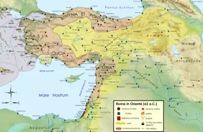 Siria era una provincia inestable por las revueltas judías (único pueblo de la zona al que Pompeyo sometió por las armas, de ahí que pagaban impuestos más gravosos que sus vecinos) o las incursiones árabes. Por eso, el Senado había decidido que sus gobernadores serían procónsules, es decir, tendrían la autoridad para declarar la guerra y reclutar tropas de forma autónoma pero en nombre de Roma.[80]