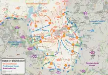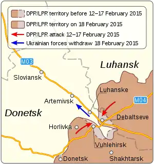 La Batalla de Debáltseve fue un enfrentamiento militar en la ciudad de Debáltseve, Óblast de Donetsk, entre las fuerzas separatistas prorrusas de la República Popular de Donetsk y la República Popular de Luhansk y las Fuerzas Armadas de Ucrania, que comenzó a mediados de enero de 2015 durante la guerra en la región de Donbas . Las fuerzas pro rusas compuestas por las milicias de Donetsk y Lugansk [11] capturaron Debáltsevo, que había estado bajo control ucraniano desde una contraofensiva de las fuerzas gubernamentales en julio de 2014. La ciudad se encuentra en una "cuña" del territorio controlado por Ucrania bordeado por la RPD por un lado y la LPR por el otro, y es un cruce vital de carreteras y ferrocarriles.[12]