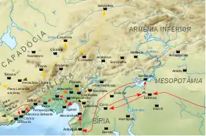 La captura del augusto dejó al Oriente romano a merced de los sasánidas. Sapor I probablemente instaló su cuartel general en Nísibis,[59] desde donde tomaría Tarso, Antioquia (nuevamente) y Cesarea,[30] haciéndose con toda Mesopotamia[60][61] y volviendo a devastar en Siria, Cilicia y Capadocia.[62] Se dice que las gargantas y colinas quedaron cubiertas de cadáveres.[63] En Cesarea ordenó deportar a sus 400 000 habitantes (según crónicas antiguas) hacia el sur persa.[27]