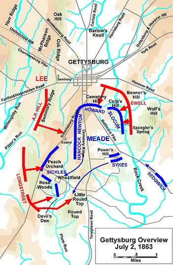 La batalla de Gettysburg fue un combate terrestre de la guerra civil estadounidense (1861-1865), librado entre el 1 y 3 de julio de 1863 alrededor del pueblo de Gettysburg (Pensilvania), como parte de la campaña de Gettysburg. Fue la batalla con más bajas en Estados Unidos, y está considerada como el punto de inflexión de la guerra civil, junto con el sitio de Vicksburg. Además, marcó el inicio de la ofensiva de la Unión.[1] Fue una gran victoria para el Ejército de la Unión y un hecho desastroso para la Confederación.