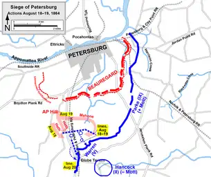 La batalla de Globe Tavern , también conocida como la segunda batalla del ferrocarril de Weldon , fue una batalla que ocurrió del 18 a 21 de agosto de 1864, al sur de Petersburg, Virginia , fue el segundo intento del ejército de la Unión para cortar el ferrocarril de Weldon durante el asedio de Petersburg de la guerra civil estadounidense . Una fuerza de la Unión bajo el general Governeur K. Warren destruyó millas del ferrocarril y soportó los fuertes contraataquess de la Confederación tropas bajo el general P.G.T. Beauregard y el teniente general A.P. Hill.