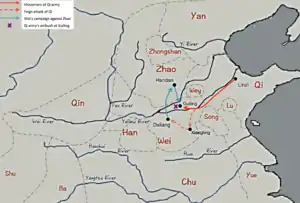 Sun Bin atacó Pingling, ciudad donde estaban guardados los suministros de Wei, siendo rechazado, sin embargo, su ataque tenía por intención sólo convencer al general Pang Juan de que el ejército de Qi era demasiado débil para derrotar y permitir que se confiara. El ejército de Wei continuó el asedio y las fuerzas de Zhao resistieron a la desesperada. Después de su fingida derrota Sun Bin atacó la capital de Wei, Dailang. Al enterarse esto por sus informantes Pang Juan dividió sus fuerzas, partió con su caballería a salvar su capital, mientras que dejó sus suministros e infantería asediando Handan. Cuando sus fuerzas llegaron al río Amarillo estaban agotadas y fueron atacadas sorpresivamente, resultando destruidas en Guiling. Pang Juan logró escapar.