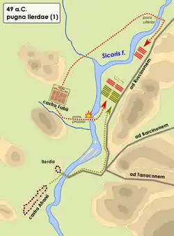 Fabio expulsó a las guarniciones de Afranio de los pasos pirenaicos,[123][131] envió mensajeros para ganar el apoyo de las tribus de la región[132] y realizó varias incursiones en busca de alimentos, enfrentándose a la caballería pompeyana.[133] Posteriormente construyó dos puentes de madera sobre el Sicoris, el pons propior y el pons ulteriores.[132] Los pompeyanos controlaban un puente de piedra cercano a la ciudad.[112]