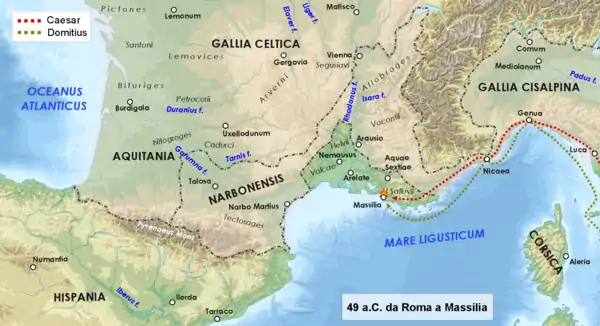 Los habitantes de Massilia cerraron las puertas a César[101] y pidieron ayuda a los albici, tribu bárbara que vivía en las montañas al nordeste de la ciudad,[102] que eran desde hace mucho sus protectores. Acumularon todo el trigo que pudieron de las regiones vecinas, organizaron fábricas de armas en la urbe y repararon las murallas, puertas y la flota. Estaban listos para aguantar un largo asedio.[103] César envió quince embajadores para recordarles que había conquistado toda Italia con facilidad y no deseaba hacerles la guerra.[104] Fue durante esas negociaciones que llegó Enobarbo con su flotilla. Bien recibido por los locales, fácilmente se hizo con el gobierno de la ciudad.[105] Su primera orden fue enviar la flotilla en todas direcciones para capturar todos los buques de carga disponibles,[106] algunos de estos son desguazados para reparar otros navíos y otros mercantes son armados. Se organiza las reservas de trigo y demás materias primas para soportar el asedio.[107] César respondió trayendo tres legiones en las cercanías e iniciando un asedio.[108] También estableció en Arelate la construcción de doce buques de guerra, que fueron acabados en treinta días y cuyo mando se confió a Décimo Junio Bruto Albino. Las legiones quedaron a las órdenes del legado Gayo Trebonio.[109] El 5 de junio partía a Hispania.[1][110]
