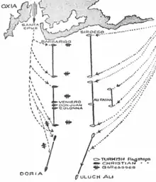El escuadrón exterior veneciano del lado derecho es casi aniquilado por las galeras que tuvieron en su frente: las de Estambul y Negroponte y las galeotas argelinas dirigidas por Uluch Alí y su hijo Kara Bey.[18] Junto a esas galeras casi exterminadas, el grupo de galeras genovesas, sicilianas y napolitanas, que se hallaba en el extremo derecho, decide unirse al escuadrón de Juan Andrea Doria, que se encontraba tras ellos, y mientras lo hicieron controlaban a las galeras sirias que avanzaban.[Bi. 25]