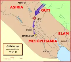 La situación geopolítica de Babilonia era peligrosa. El imperio persa la rodeaba por el norte, este y oeste. Su situación interna era vulnerable: tenía problemas económicos exacerbados por la peste y la hambruna. Su rey Nabonido era impopular por su heterodoxia religiosa. Según Mary Joan Winn Leith, «el éxito de Ciro se debe a su fuerza militar, a sobornos atinados y a una gran campaña de propaganda que lo presentó como un señor religioso y tolerante en Babilonia».[8] Por otro lado, Max Mallowan hace notar: «La tolerancia religiosa era una característica notable del gobierno persa y no hay ninguna duda de que Ciro era un promotor de mente liberal de esta política humana e inteligente» y tal campaña de propaganda fue una forma de que su reputación precediera a las operaciones militares.[9] Ciro persuadió a un gobernador provincial babilónico llamado Gobrias (y un supuesto Gadates) de desertar a su bando. Gutium, el territorio gobernado por Gobrias, era una región fronteriza de importancia estratégica que sirvió de base a la invasión de Ciro.[7]