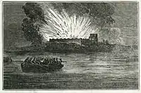 - Mahon, p347 citando una carta de Cochrane al Almirantazgo fechada el 25 de agosto de 1814: Nicolls, otros 3 oficiales, un cirujano, 11 suboficiales y 97 soldados desembarcaron y ocuparon el Fuerte San Miguel.