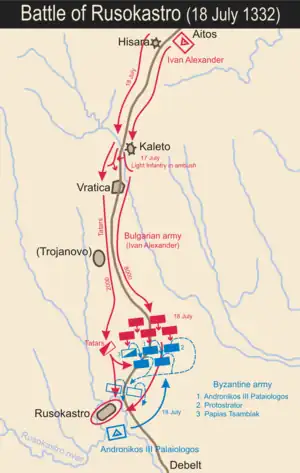 La batalla comenzó a las seis de la mañana y se prolongó durante tres horas. Los bizantinos trataron de impedir que la caballería búlgara les rodeara, pero no lograron su maniobra. La caballería se movió en torno a la primera línea bizantina sin preocuparse de la infantería y cargaron contra la retaguardia de sus flancos. Después de una lucha feroz los bizantinos fueron derrotados, escapando del campo de batalla y escondiéndose en Rusokastro. El ejército búlgaro rodeó la fortaleza y al mediodía del mismo día Iván Alejandro envió embajadores a continuar las negociaciones.