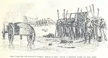 Davies atacó la sección de cabeza de la caravana, dos compañías de artillería, a 4 millas (6,4 km) al este de Paineville, y rápidamente acorraló a 300 soldados y otros tantos cocheros afroamericanos.[36] Los soldados de caballería de la Unión cortaron muchos caballos y mulas de sus rastros, capturaron cinco cañones Armstrong nuevos y quemaron más de 100 carros de provisiones. Los soldados de Davies destruyeron los suministros del mayor general Custis Lee, incluyendo toda la munición de repuesto.[37] Los vagones principales del tren que salió de Amelia Court House, incluyendo el equipaje del cuartel general de Fitzhugh Lee, los vagones del cuartel general de Robert E. Lee con muchos informes y algunas ambulancias y suministros médicos, también fueron capturados por los asaltantes de la Unión.[35][38] Los rezagados y los soldados enfermos finalmente se reunieron para detener la destrucción.[38]