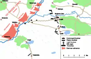 Atacaron en ese momento los blindados alemanes y uno a uno fueron cayendo los búnkeres que obstruían el paso a las fuerzas germanas, la mayoría de los defensores fueron abatidos, en total unos 660 polacos, el capitán Reginis prefirió el suicidio con su propia granada en su búnker GG-126 que ser tomado prisionero. Los búnkeres fueron dinamitados por los alemanes a su paso y solo se logró capturar unos 40 soldados polacos que fueron salvajemente golpeados antes de ser llevados prisioneros. Unos 40 soldados polacos pudieron escapar del cerco refugiándose en Bialystok.
