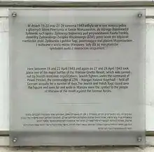 Las actividades bélicas en la Plaza Muranowski también están relacionadas en un informe de 75 páginas de Jürgen Stroop, general de las SS y la policía, quien era el comandante de las unidades alemanas que luchaban contra el levantamiento. Según el informe: "El principal grupo de judíos, mezclado con bandidos polacos, se retiró a la llamada Plaza Muranowski en el primer o segundo día de las luchas. Allí fueron rearmados por un gran grupo de bandidos polacos. Este grupo decidió fortificarse de todas las maneras posibles para evitar que siguiéramos penetrando en el área del gueto. Levantaron dos banderas judías y polacas en el techo del edificio de hormigón como señal para luchar contra nosotros. Estas dos banderas fueron capturadas en el segundo día de la acción durante la incursión del grupo especial de batalla. El Untersturmführer Demke de las SS murió en la lucha contra los bandidos. (Informe Stroop, abril de 1943)".[28][29][30][31]