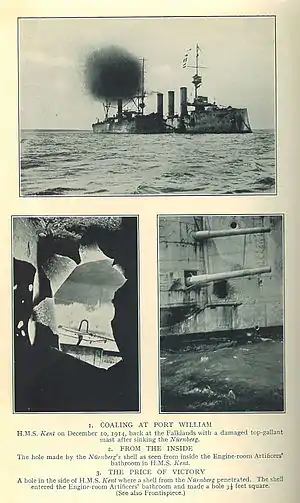 Por su parte, el Kent persiguió al pequeño Nürnberg, que con gran esfuerzo logró alcanzar los 25 nudos, dos más que el Kent. Sin embargo, no lograron mantenerlos, las calderas sobreexigidas debieron parar y se redujo la velocidad. El capitán de navío, Schönberg, ordenó embestir al Kent. Este lo dejó acercarse, y cuando distaban 700 m, cañoneó a mansalva al Nürnberg, que terminó por detenerse, alzar la popa e irse a pique. De una dotación de 322 hombres, solo se salvaron 7. Otto von Spee, el otro hijo del almirante a bordo del Nürnberg, tampoco sobrevivió.