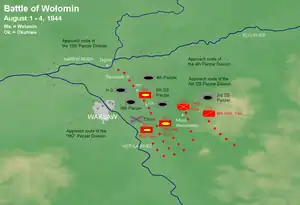 La batalla frente a Varsovia comenzó el 1 de agosto con un ataque de pinza por parte de un grupo de combate de la 19.ª División Panzer y la 5.ª División Panzer SS Wiking de Prusia Oriental hacia la ciudad de Okuniew. El otro grupo de combate de la 19.ª División Panzer atacó desde el noroeste hacia Radzymin, mientras que la División SS «Wiking» atacó a ambos lados de la carretera Węgrów-Okuniew y la división SS «Totenkopf» del área de Kałuszyn avanzó en dirección general suroeste hacia Minsk-Mazowiecki. Fue posible despejar la carretera Vyskov-Varsovia y en el proceso cercar al 3.er Cuerpo de Tanques soviético. Después de la llegada completa de la 4.ª División Panzer alemán también se reconquistó a la perdida Radzymin. El 3 de agosto el 3.er Cuerpo de Tanques soviético fue acorralado en los alrededores de Wolomin. Ahora 4 Divisiones Panzer alemanas atacaron concéntricamente desde 4 direcciones. Hasta el 4 de agosto el Cuerpo de Tanques fue aniquilado. Ataques de socorro del 16.º Cuerpo de Tanques y de unidades de infantería motorizadas del 1.er Ejército Polaco fueron repelidos.[6]