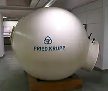 Esta esfera de presión fue reemplazada en diciembre de 1958 por otra fundida por la Krupp Steel Works[6] de Essen, Alemania, en tres secciones; un anillo ecuatorial y dos tapas, que fueron mecanizadas finamente y unidas por los Ateliers de Constructions Mécaniques de Vevey. La nueva esfera también era de acero, pero más pequeña, con un diámetro de 2,16 metros (7,1 pies) y con paredes más gruesas, de 127 milímetros (5 plg),[3] calculadas para resistir la presión de 1250 kilogramos/cm² (122,6 MPa) en el fondo de la Fosa de las Marianas más un sustancial factor de seguridad. La nueva esfera pesaba 14,25 toneladas (31 415,9 lb) en aire y 8 toneladas (17 637 lb) en agua, dándole una gravedad específica promedio 2.6 veces (o 1.6 veces mayor que) la del agua de mar (13÷(13−8)).[7][8] Las observaciones exteriores por parte de la tripulación se realizaban a través de un ojo de buey hecho de un solo bloque cónico de plexiglás, el único material transparente disponible que podía resistir la presión. La iluminación exterior era mediante lámparas de arco de cuarzo, que podían resistir la presión sin modificaciones.[9]