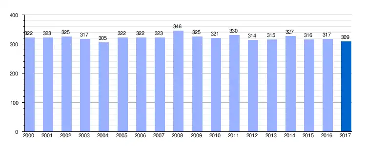 | Gráfica de evolución demográfica de Bayas entre 2000 y 2017 |
