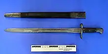 Uno de estos diseños polivalentes era la bayoneta "con dientes de sierra", que incorporaba dientes de sierra en el lomo de la hoja.[14] La bayoneta con dientes de sierra estaba pensada para su uso como herramienta de utilidad general, así como arma; los dientes estaban pensados para facilitar el corte de madera para diversos trabajos defensivos, como postes de alambre de espino, así como para descuartizar ganado.[2][15][16][17] Inicialmente fue adoptada por los estados alemanes en 1865; hasta mediados de la Primera Guerra Mundial aproximadamente el 5% de cada estilo de bayoneta se complementó con una versión sawback, por ejemplo en Bélgica en 1868, Gran Bretaña en 1869 y Suiza en 1878 (Suiza introdujo su último modelo en 1914).[2][15][16][17][18] Las bayonetas sawback originales eran típicamente del tipo espada pesada, se entregaban a los ingenieros, y hasta cierto punto el aspecto de bayoneta era secundario al de "herramienta". Más tarde, las bayonetas de sierra alemanas eran más un indicador de rango que una sierra funcional. La bayoneta de sierra demostró ser relativamente ineficaz como herramienta de corte, y pronto quedó desfasada por las mejoras en la logística militar y el transporte; la mayoría de las naciones abandonaron la bayoneta de sierra hacia 1900.[2] El ejército alemán dejó de utilizar la bayoneta de sierra en 1917 tras las protestas de que la hoja dentada causaba heridas innecesariamente graves cuando se utilizaba como bayoneta fija.[2][17]