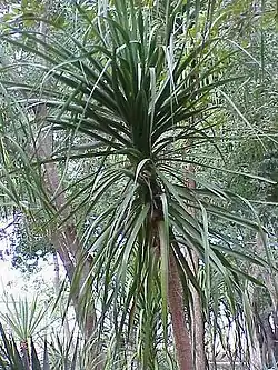Los ejemplares silvestres alcanzan hasta 15 metros de altura, con un tallo de 20 cm a 4 m de diámetro. Las plántulas crecen con un solo tallo, estás plantas son de muy lento crecimiento. Las hojas son perennes, lineales, de 50 a 180 cm de longitud y de 1,5 a 2 cm de ancho, con textura coriácea y márgenes finamente serrados. Las flores se producen formando una gran panícula de 75 a 110 cm de longitud. Las flores son muy numerosas pero pequeñas (1,5 mm diámetro), de color blanco verdoso y con seis tépalos.