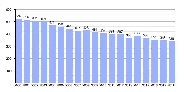 | Gráfica de evolución demográfica de Beba[4] entre 2000 y 2018 |