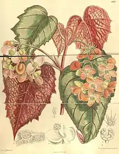 Similar a Begonia palmata , esta especie se diferencia por su corto, grueso rizoma, la falta de hojas en el rizoma, tallo erecto y hojas muy divididas superficialmente. Flores de color rosa o anaranjado se observaron en las plantas de esta especie.