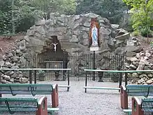 El patio está ubicado entre las residencias estudiantiles Poellath y O'Connell, ambas construidas a principios de la década de 1960. Raphael Arthur Hall, construido en 1967, ofrece a los estudiantes habitaciones individuales y se encuentra en la colina sobre Poellath, cerca de Campus Police. La Capilla de Adoración Eucarística de San José, dedicada en 2008, se encuentra frente al Campus Police. Wheeler Athletic Center, terminado en 1970, está ubicado detrás de Poellath Hall. En la parte trasera del campus se encuentran los cuatro edificios de apartamentos Cuthbert Allen, construidos en 1989. El recientemente renovado Student Commons, ubicado junto a la nueva cafetería, alberga la sala de correo del campus, máquinas de refrigerios, una sala de estar y oficinas de Student Life. Detrás de Student Commons se encuentran las residencias universitarias St. Scholastica y St. Benedict. La Gruta de Lourdes, un santuario oficial de peregrinación está situada detrás de O'Connell Hall.