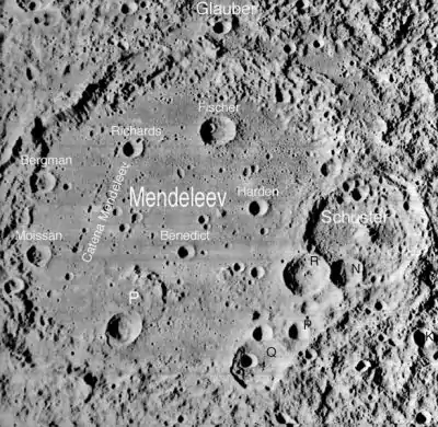 Benedict es un pequeño cráter en forma de cuenco que se encuentra en el interior del cráter Mendeleev, cerca del ecuador en la cara oculta de la Luna.