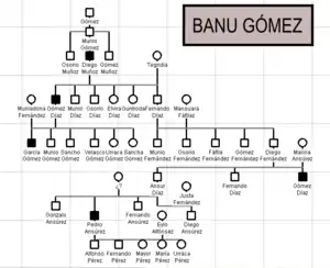 Los últimos condes de la familia de los Banu Gómez fueron los hijos y nietos de Gómez Díaz y Teresa Peláez. De sus hijos, García Gómez fue educado por sus tíos maternos y aparece frecuentemente en la corte de Alfonso VI. Probablemente murió en batalla de Uclés en 1108.[42] Otro hermano, Fernando, que no dejó mucho rastro en la documentación, falleció en 1083.[43][44] Fue Pelayo Gómez quien sería el próximo jefe de la familia. Se casó con Elvira Muñoz, media hermana del conde Rodrigo Muñoz lo que le dio una nueva base de poder en Galicia que incluía una parte del monasterio de Santa María de Ferreira de Pallares. Murió en 1101 y fue enterrado en el monasterio de San Zoilo, donde su esposa, hijos y nietos también recibieron sepultura.[45][46][47] Munio y Gómez Peláez, dos de sus hijos conocidos, alcanzaron la dignidad condal. Gómez Peláez, fallecido en 1118, fue conde durante el reinado de Urraca en la década de 1110, con propiedades en Tierra de Campos. Contrajo matrimonio con Mayor García, hija del conde García Ordóñez y nieta del rey García Sánchez III de Pamplona. Fueron padres de García, Pelayo, Diego, Urraca[45] y Teresa Gómez.