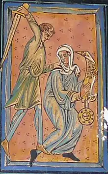 La segunda representación legendaria de los Banu Gómez se basa en el antagonismo histórico entre Rodrigo Díaz de Vivar El Cid y la familia del conde Pedro Ansúrez. El Cantar de Mio Cid habla del matrimonio de las dos hijas de El Cid, Elvira y Sol, con los Infantes de Carrión, Diego y Fernando González. Responden a su humillante fracaso en un complot para asesinar a uno de los aliados de El Cid atando, golpeando y abandonando a sus esposas en un bosque a merced de los lobos. Las hijas son rescatadas y El Cid exige el retorno de sus dotes, dos famosas espadas de batalla. Obtiene la anulación de los matrimonios y casa a sus hijas con un príncipe de Navarra y otro de Aragón. Los Infantes de Carrión no son figuras históricas. Su patronímico sugiere que fueron hijos de Gonzalo Ansúrez, hermano del conde Pedro. Sin embargo, Gonzalo no fue padre de ningún Diego o Fernando, aunque sí que tuvo hermanos llamados Diego y Fernando Ansúrez, y estos mismos nombres figuran entre los hijos menores del conde Gómez Díaz. Aunque dos personajes llamados Diego y Fernando aparecen juntos en la documentación medieval coetánea, no hay indicios de que estuvieran vinculados con Carrión y los Banu Gómez. Se pueden considerar a estos infantes de Carrión como construcciones literarias, personajes compuestos destinados a encarnar la rivalidad y el antagonismo entre El Cid y los Banu Gómez.[71]