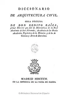- — (1802). Diccionario de Arquitectura civil. Obra Póstuma de Don Benito Bails. Edición facs. Colegio Oficial de Aparejadores y Arquitectos Técnicos de Asturias, 1973. Madrid: Imprenta de la viuda de Ibarra.