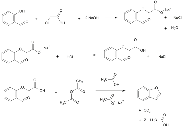 El benzofurano puede ser preparado por O-alquilación del salicilaldehído con ácido cloroacético seguido por deshidratación del éter resultante.