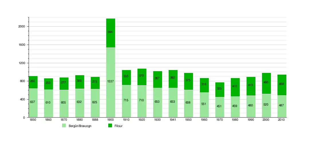 La población histórica se da en la siguiente tabla. Durante la construcción de la línea del Ferrocarril Rético, la población de ambas comunidades aumentó significativamente.[4]