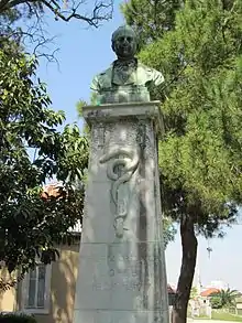 Un busto de bronce asentado sobre un pedestal de piedra, se erigió en su homenaje, siendo obra del escultor Costa Mota, inaugurado en 1930, en la Plaza Dr. Bernardino António Gomes, en Campo de Santa Clara.[1]