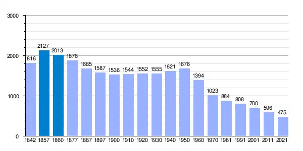 Más allá del declive poblacional de las últimas décadas, la evolución demográfica durante la Edad Moderna y los inicios de la Edad Contemporánea fue ascendente, pasando de 1000 habitantes en 1768 a 1490 en el año 1787, es decir, un incremento del 50% en algo menos de dos décadas. A mediados de la centuria posterior se sobrepasaron los 1800 habitantes, cifra en la que se estabilizó la población hasta ir reduciéndose a mitad del siglo XX.[14]