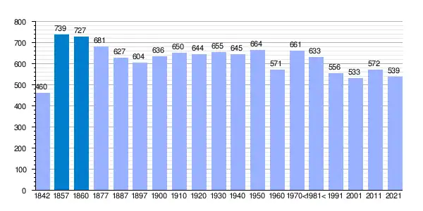 | Gráfica de evolución demográfica de Bernedo[5] entre 1842 y 2021 |
