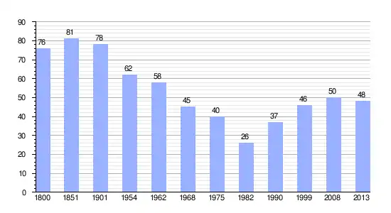 Los datos demográficos contemplados en este gráfico de la comuna de Beuzeville-au-Plain[4] se han cogido de 1800 a 1999 de la página francesa EHESS/Cassini, y los demás datos de la página del INSEE.[5]