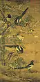 - Tres urracas y flores de primavera, tinta y color sobre seda, rollo en altura;