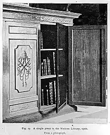 - «La Biblioteca del Congreso: Roma renacida: La Biblioteca Vaticana y la cultura del Renacimiento - La Biblioteca Vaticana - Una biblioteca toma forma: Libros, bancos y prestatarios». Biblioteca del Congreso. Consultado el 2 de agosto de 2014.