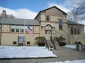 El edificio fue diseñado por el estudio de arquitectura Pond and Pond de Chicago y está construido con ladrillos de color beige. El marcapiano de ladrillo rojo y los acentos contrastan con el ladrillo de color beige en la mayor parte de la fachada. El edificio de dos pisos tiene un sótano de ladrillos completo y unos 511 m².[6]