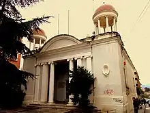 Es un edificio aislado. La fachada principal presenta tres cuerpos, uno central y dos laterales simétricos, encima de ellos se elevan dos templetes de base circular con ocho columnas jónicas que sostienen una cubierta semiesférica. El cuerpo central está formado por dos columnas y cuatro pilastras jónicas, y da acceso al vestíbulo de entrada. La culminación la forma un frontón coronado por tímpano de línea sinuosa. Está construido con ladrillo revestido. Está pintado de gris y blanco;)