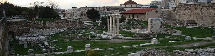 - Tsalkanis, Dimitrios. «Roman Market - Library of Hadrian». Ancient Athens 3D (en inglés). Archivado desde el original el 17 de julio de 2014.