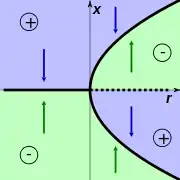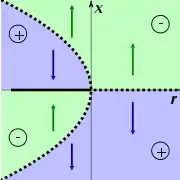 Para los valores negativos de , hay un equilibrio estable en . Para hay un equilibrio inestable en , y dos equilibrios estables para .