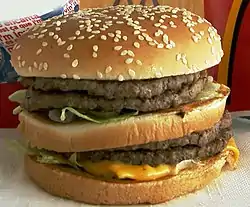 Big Mac es un tipo de hamburguesa que se comercializa desde el año 1967 en la cadena de restaurantes de comida rápida McDonald's. En su eslogan publicitario más conocido se describe su composición "Two all beef patties, special sauce, lettuce, cheese, pickles, bacon, onions on a sesame seed bun" (Que en español se anuncia como: "Dos de carne, salsa especial, lechuga, queso, pepinillos, pancenta, cebolla y pan con semillas de ajonjolí. Hacen el sabor del Big Mac.").[1] publicado en el año 2001.