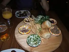 Cuenco de bigilla (a la derecha de los panecillos) en una tabla de entremeses típicos malteses.