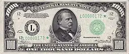 El gobierno estadounidense emitió billetes de 1000 dólares entre 1862 y 1946 a través de varias instituciones financieras. En concreto el que figura en la imagen fue impreso en 1928 y lleva el retrato del 22º y 24º presidente de los EE. UU., Grover Cleveland. Los billetes ocuparon el noveno lugar en denominaciones de billetes de dólares.