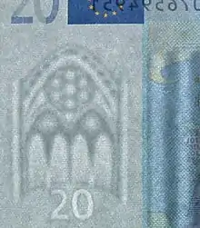 Todos los billetes muestran puentes y arcos en un estilo arquitectónico europeo diferente; y en el caso del billete de veinte euros, ese estilo corresponde a la era gótica (Siglos XII y XIV). Aunque los diseños originales de Robert Kalina pretendían mostrar monumentos reales, los motivos empleados muestran únicamente monumentos ficticios de cada era arquitectónica, con el fin de evitar polémicas sobre cuáles deberían ser incluidos.