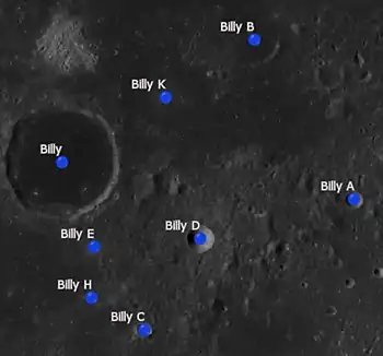 Por convención estos elementos son identificados en los mapas lunares poniendo la letra en el lado del punto medio del cráter que está más cerca de Billy.