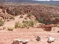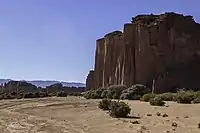| Monte de sierras y bolsones | Es una estepa arbustiva tendida sobre valles intermontanos, bolsones y laderas serranas. | Especies arbóreas, como el algarrobo. | Guanacos, tortugas terrestres, pumas, vizcachas, el pichiciego menor, la boa de las vizcacheras y el águila coronada. | ![]() |