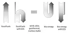 Esquema de flujo de carbono para diferentes sistemas energéticos.El principal atractivo de BECCS es su capacidad para generar emisiones negativas de CO2. La captura de dióxido de carbono de fuentes bioenergéticas elimina efectivamente el CO2 de la atmósfera.